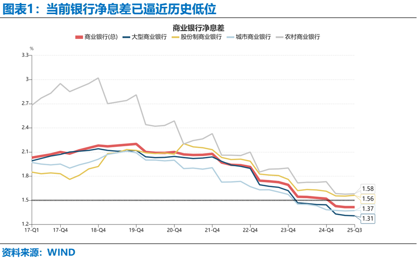本次率先落地的结构性工具利率下调,是货币政策发力的标志性一步。从银行角度看,净息差承压问题一直是近年来市场及国家政策关注的核心痛点。相关数据显示,当前银行净息差已逼近历史低位,这一状况制约了此前总量宽松政策的推进空间。若在净息差持续收窄的背景下贸然实施全面降准降息,银行盈利空间将进一步压缩,金融风险放大的同时,宽松政策也难以有效传导至实体经济。