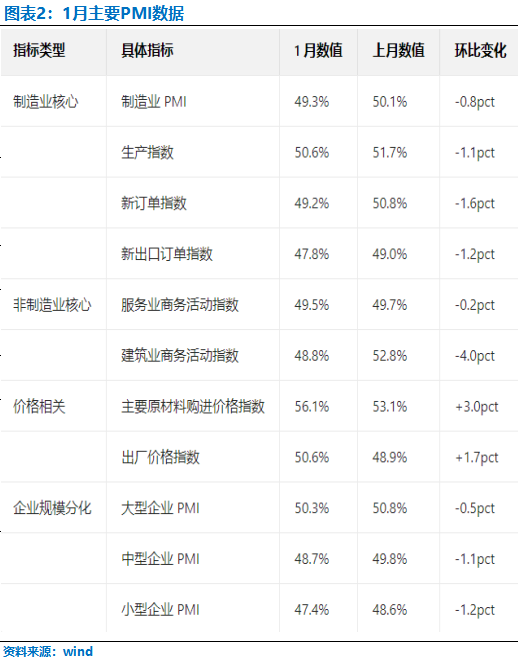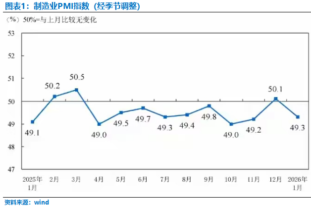 1月PMI的回落并非单一因素导致,而是季节性效应、需求不足与结构性矛盾多重叠加的结果。2026年春节较晚,使得2025年12月企业集中“抢生产、抢订单”以规避停工风险,这种提前透支直接导致1月新订单指数从50.8%骤降至49.2%,环比降幅达1.6个百分点,成为拖累PMI的核心因素。同时,1月低温天气与春节临近加剧了传统淡季效应,建筑业受务工人员返乡、项目停工影响,建筑业商务活动指数环比大幅下降4.0个百分点至48.8%,创近年同期最低水平。而更深层的矛盾在于内需的持续疲软:12月商品房销售面积同比下降8.7%,地产销售低迷直接传导至上下游产业链;汽车、家电等耐用品消费高频数据走弱,乘用车销量同比下降8.4%,消费品行业PMI降至48.3%,显示居民消费意愿仍未得到有效提振。外需方面,新出口订单指数维持在47.8%的深度收缩区间,内外需同步走弱的压力进一步凸显。