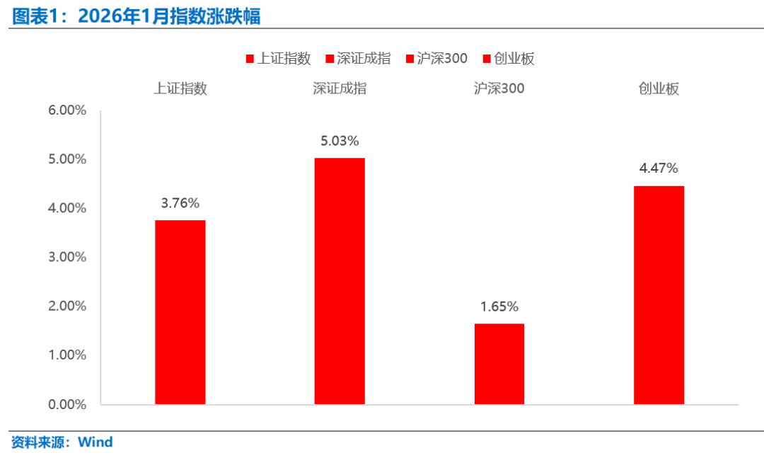 2026年1月,A股市场延续了2025年末的反弹趋势,主要股指呈现“冲高后窄幅震荡”格局。1月上证指数累计上涨3.76%,深证成指涨5.03%,沪深300涨1.65%,创业板指涨4.47%,科创50指数表现尤为亮眼,单月涨幅达12.29%。市场交投活跃,沪深两市成交额连续20个交易日突破2.5万亿元,显示投资者的热情高涨,增量资金可能也在快速入场。从指数表现看,中小盘成长风格占优,中证1000、科创50等指数涨幅显著,而沪深300、上证50等大盘宽基指数则因资金阶段性调仓出现回调,沪深300 ETF单月净流出近5800亿元。