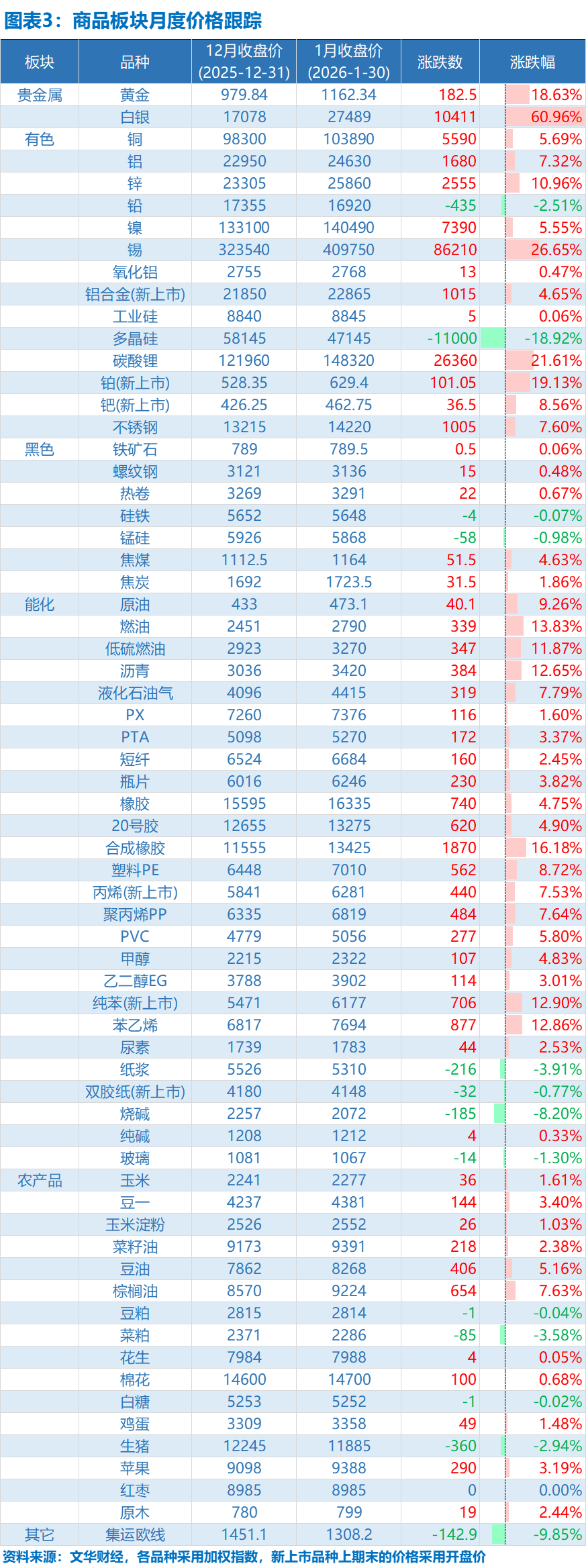 1月大宗商品市场整体呈现“宏观情绪回暖驱动下的结构性普涨”特征,文华商品指数大幅走强并于月末降温,收于171.66,月涨幅4.18%。全球经济增长预期改善、地缘政治风险持续以及主要央行货币政策转向预期,共同推升了市场风险偏好,多数板块共振上行,尤其是对宏观情绪敏感的贵金属、能源及部分基本金属涨幅领先,而部分受自身供需基本面主导的品种则表现分化。分板块来看,贵金属板块一枝独秀,黄金与白银分别大幅上涨18.63%和60.96%,成为市场最亮眼的核心,主要反映了在中东局势等地缘冲突持续及全球经济增长不确定性的背景下的避险需求;有色金属板块整体走强,铜、铝、锌等主要金属价格显著上涨,多晶硅在反内卷政策遭遇降温后大跌18.92%;黑色系板块温和上涨,铁矿石、螺纹钢、焦炭等品种普遍录得小幅正增长,但房地产领域等面临长期压力,复苏力度仍待观察;能源化工板块涨势强劲,受中东地区地缘冲突升级引发的供应担忧直接驱动,原油及下游燃油、沥青等产品价格大幅攀升,化工品种也普遍跟涨,PX、PTA、塑料、甲醇等均有不错表现,主要体现成本推动及需求边际改善的双重逻辑;农产品板块则表现不一,油脂类(豆油、棕榈油)受外盘及生物燃料需求提振涨幅明显,生猪价格继续下行,当前农产品更多由各自独立的供需基本面主导,对宏观因素的反应相对不敏感。